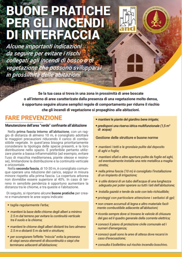 Per contrastare tale problematica il Corpo Nazionale dei Vigili del Fuoco, in collaborazione con l’ANCI (Associazione Nazionale Comuni Italiani), ha realizzato un manifesto ed un vademecum finalizzati all’attività di protezione delle abitazioni dagli incendi di vegetazione.
