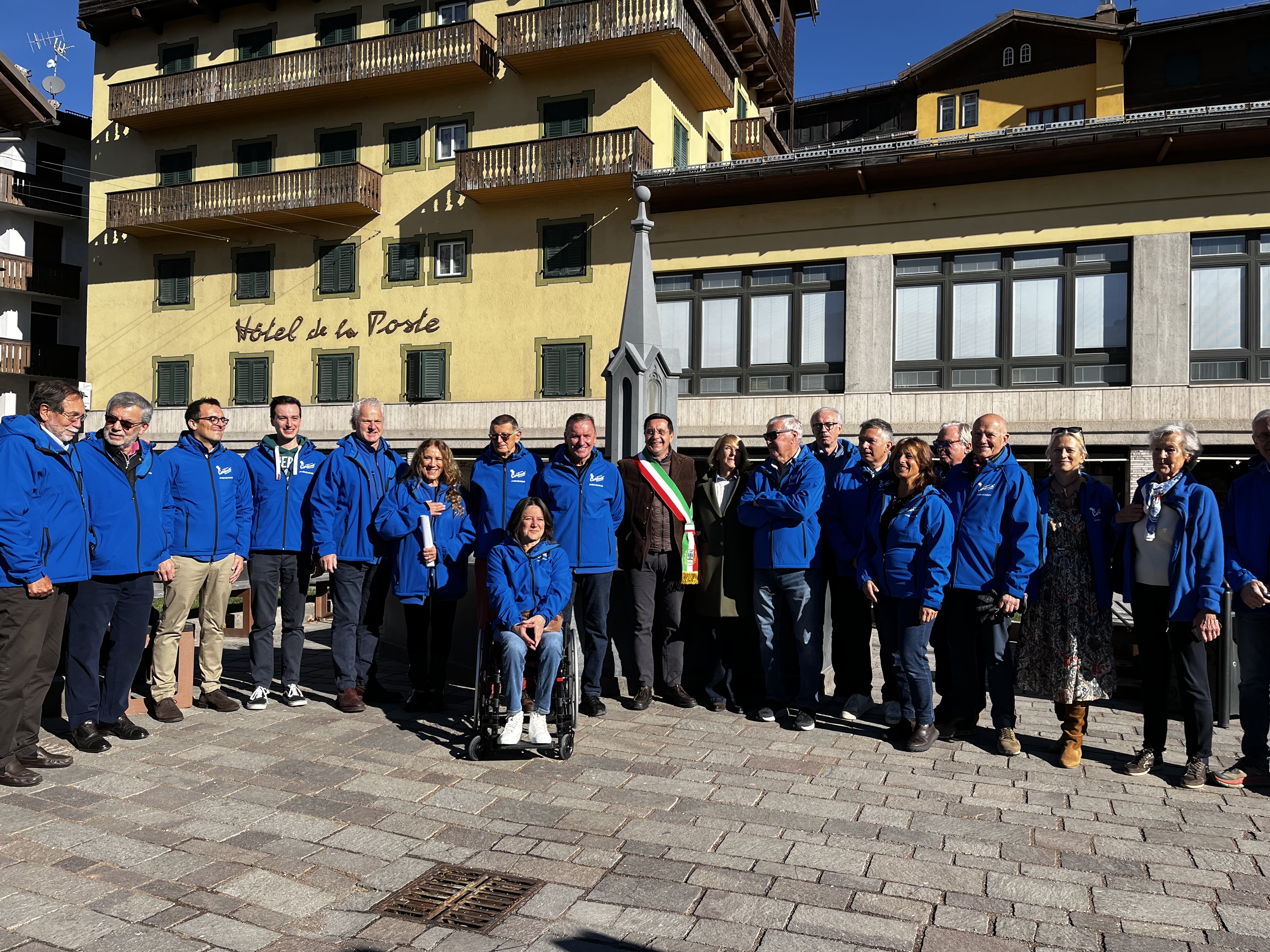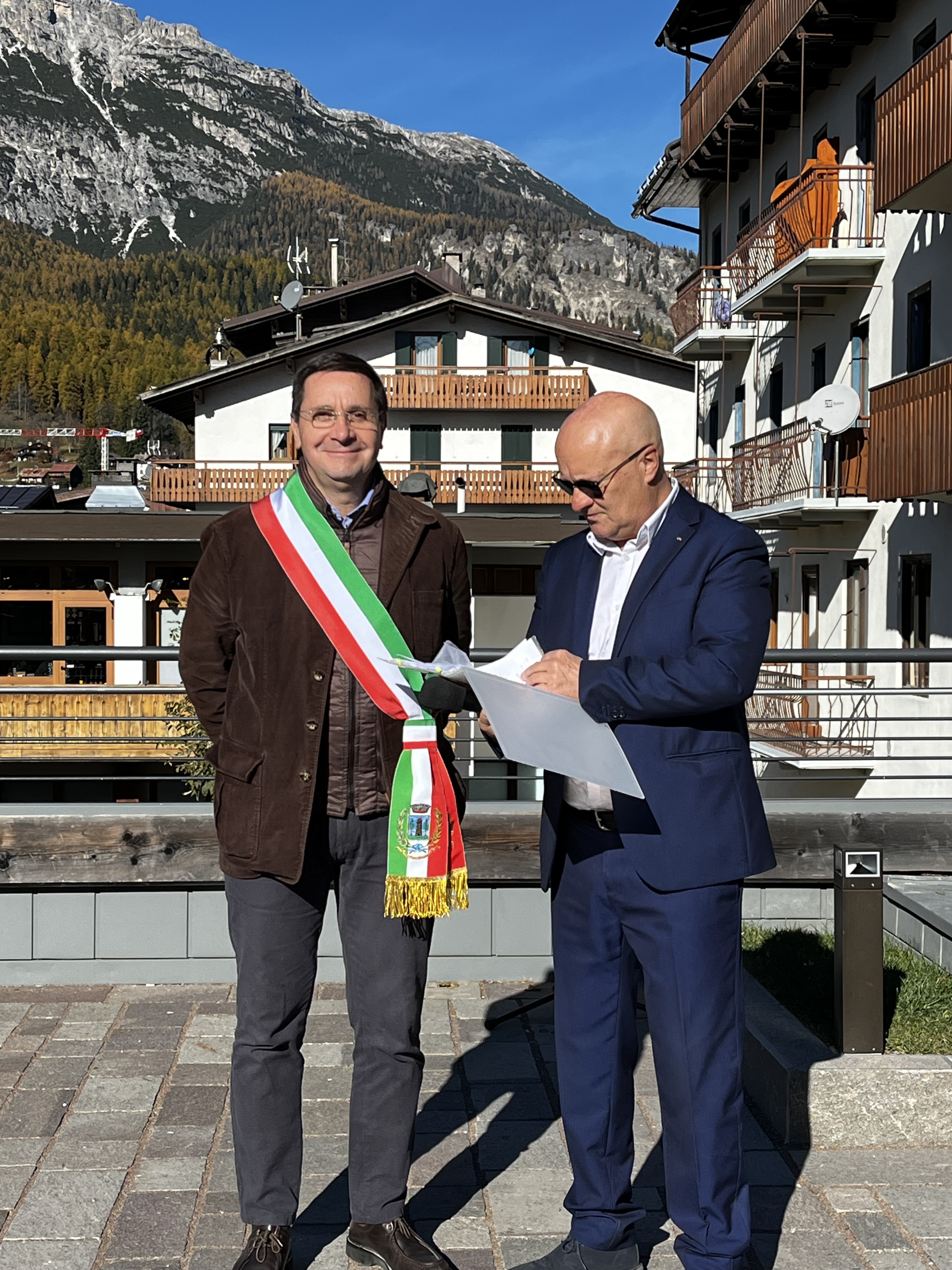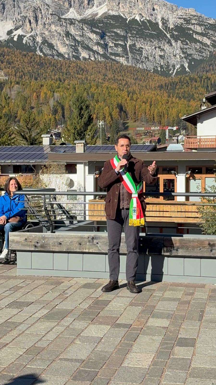 Oggi celebriamo anche un luogo simbolico della nostra città: la piazza che un tempo ospitava la partenza della funivia per Pocol, poi conosciuta come “ex Esso”, e che oggi è diventata uno spazio iconico, affacciato su uno scenario unico – le Tofane, le 5 Torri, il Becco di Mezzodì. Un luogo che rappresenta al meglio la rinascita e la forza di Cortina.