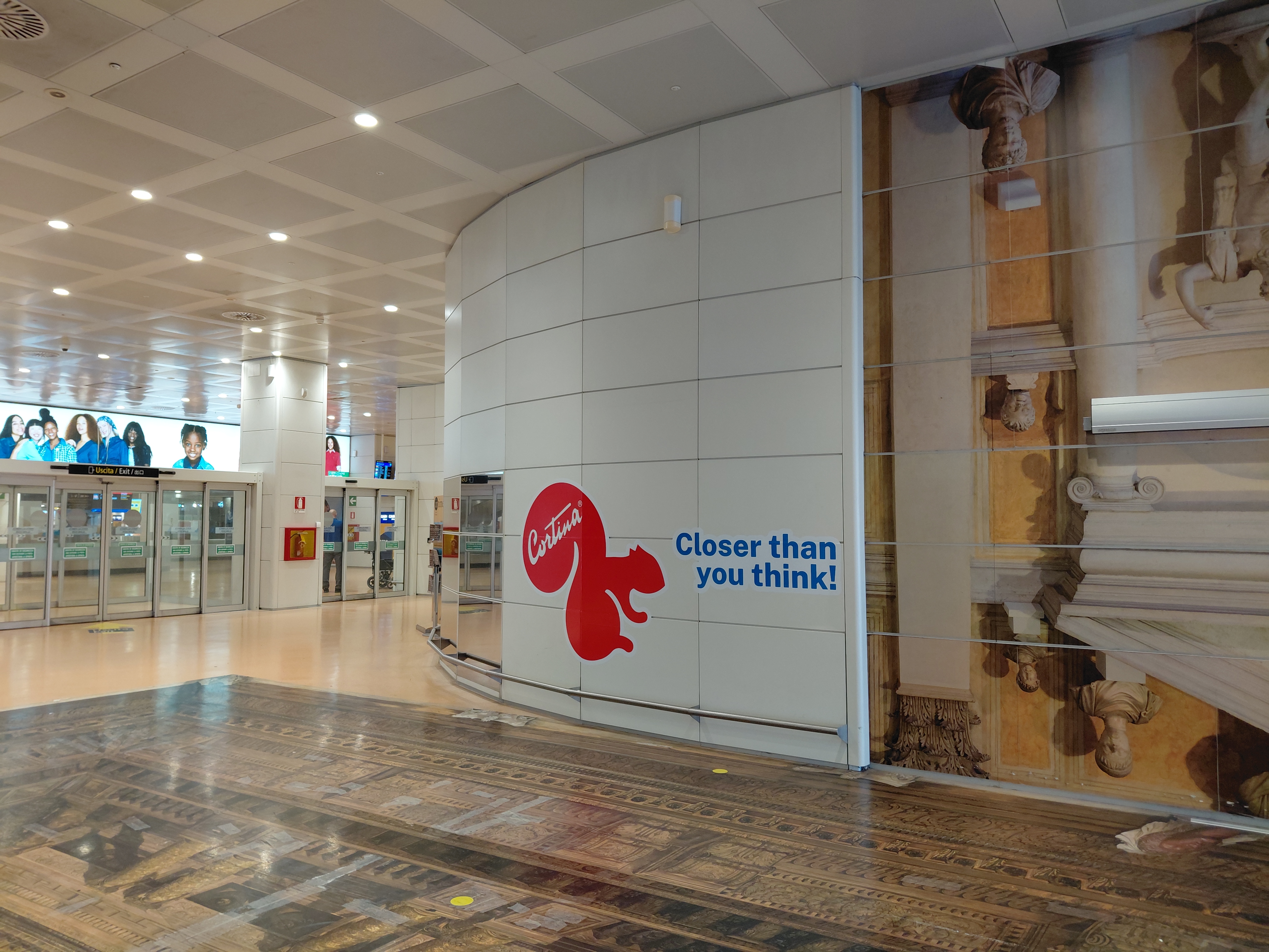 Un richiamo realizzato attraverso immagini suggestive delle montagne più rappresentative di Cortina, accompagnate dall’iconico simbolo dello scoiattolo rosso, inserite nell’area di riconsegna bagagli che diviene vetrina internazionale per la Regina delle Dolomiti.