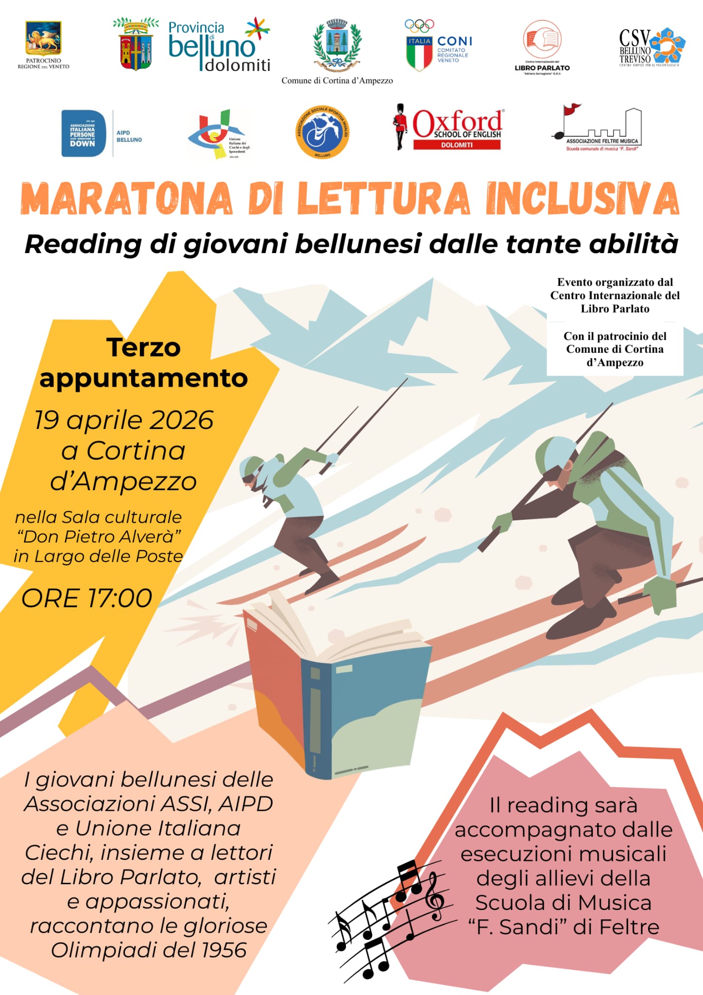 Domenica 19 aprile 2026 a Cortina d'Ampezzo i giovani bellunesi delle Associazioni ASSI, AIPD e Unione Italiana Ciechi, insieme ai lettori del Libro Parlato, artisti e appassionati, raccontano le gloriose Olimpiadi del 1956.