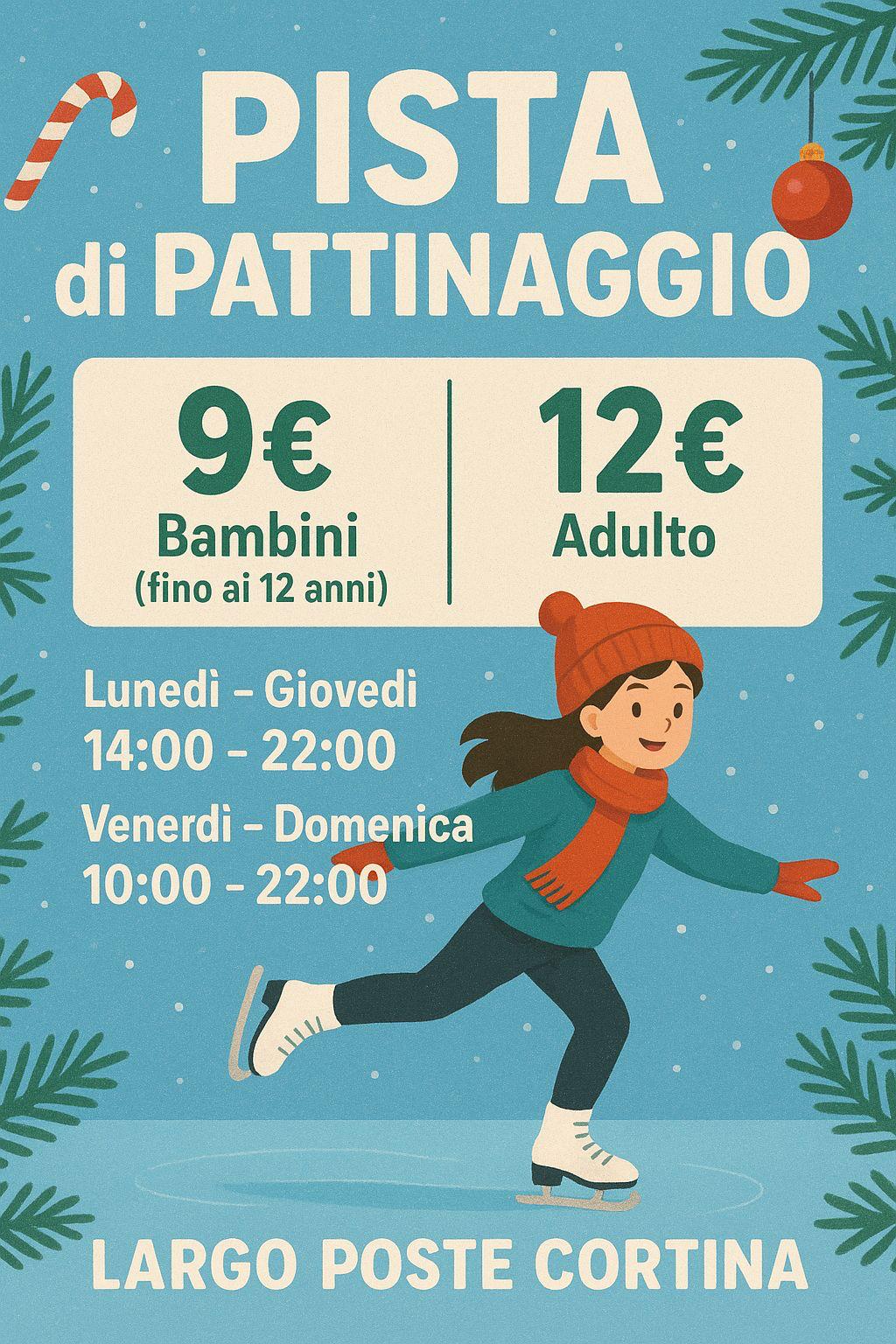 La pista di pattinaggio sarà aperta al pubblico fino al 6 gennaio con i seguenti orari:-da oggi al 19/12/2025 dal lunedì al giovedì dalle 14:00 alle 22:00, dal venerdì alla domenica dalle 10:00 alle 22:00-durante le vacanze di Natale dal 20/12/2025 al 6/01/2025 da lunedì a domenica dalle ore 10:00 alle 24:00-il giorno di Natale ore 15:00-22:00Il noleggio dei pattini è compreso nel biglietto.
