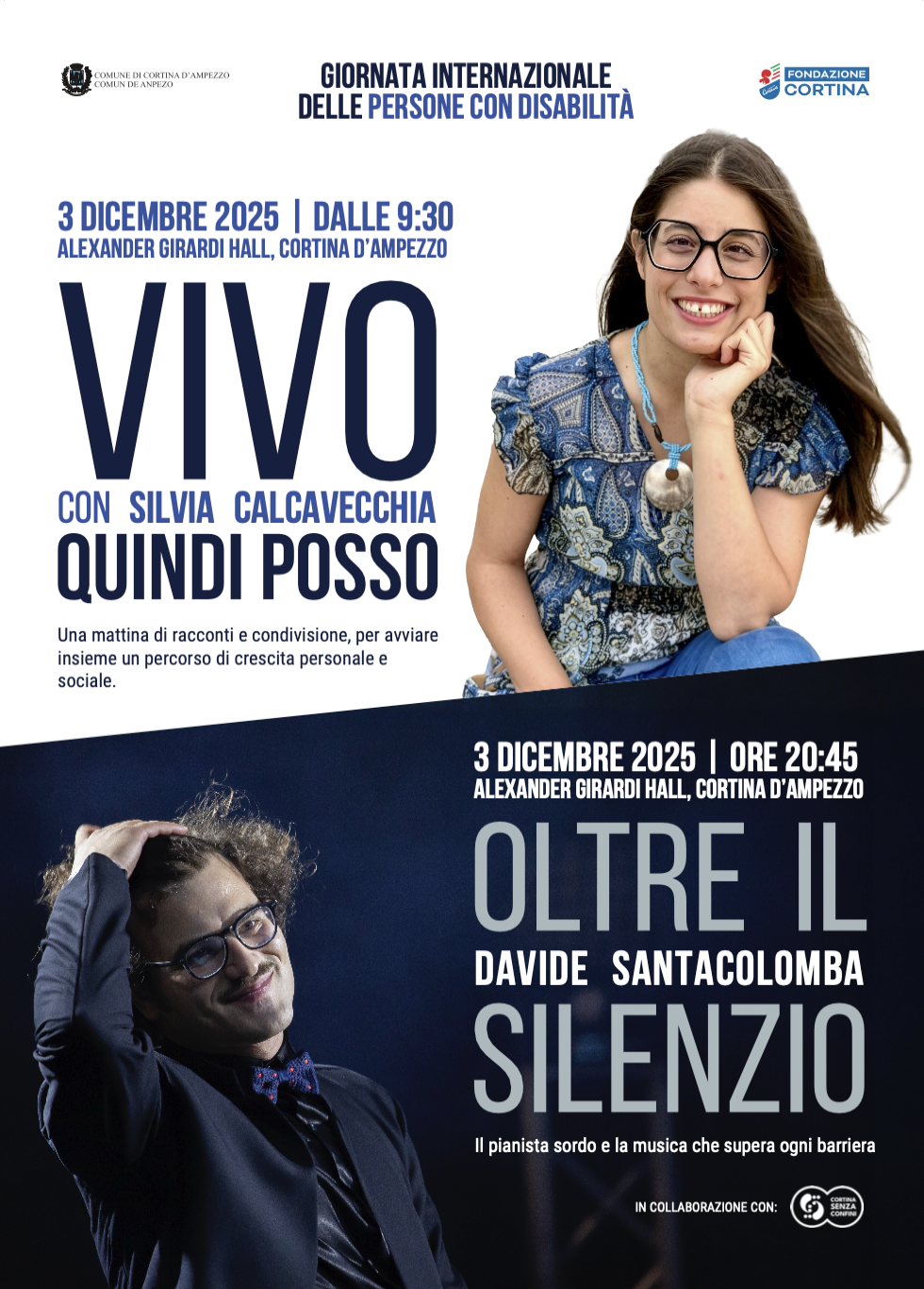 in occasione della Giornata Internazionale delle Persone con Disabilità, il Comune di Cortina d'Ampezzo e Fondazione Cortina hanno il piacere di invitarVi agli eventi organizzati per il 3 dicembre 2025 presso l’Alexander Girardi Hall di Cortina d’Ampezzo.